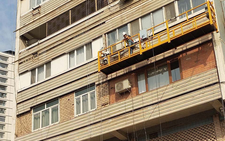 Лебедка с рабочими курсирует вверх-вниз по дому, которому «повезло» первому стать жертвой. Накануне здесь демонтирована часть кондиционеров. Очевидно, демонтаж продолжается.