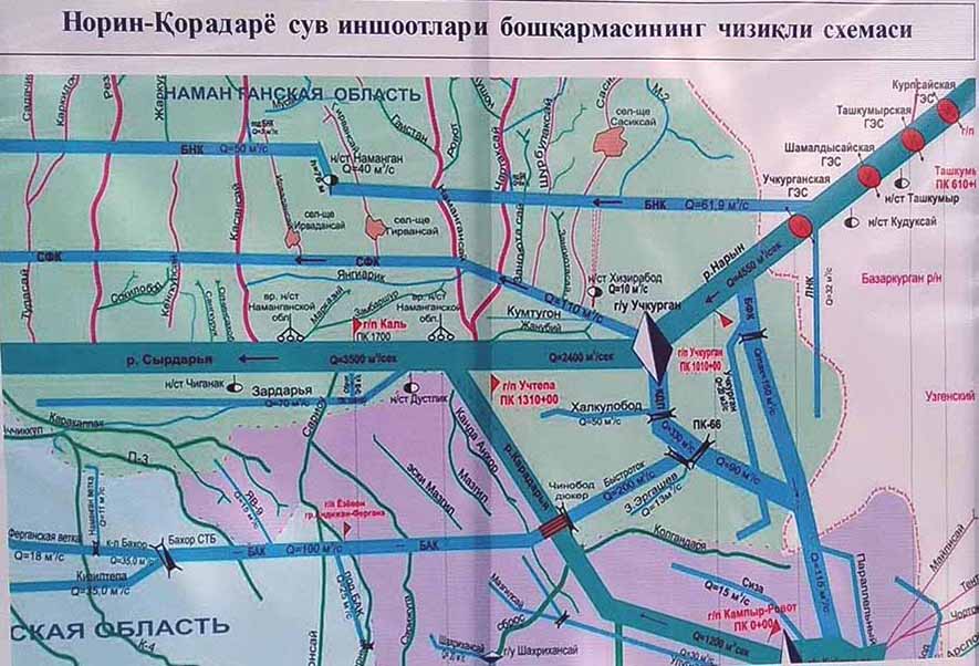 На схеме Учкурганский гидроузел изображен в виде ромба. Отвод идет параллельно реке. Река, как только слились Нарын и Карадарья, получает имя Сырдарья. Мы любовались ею в Худжанде. Мы ее еще не раз увидим в Ферганской долине. И не раз обратимся к теме каналов. Крупная оросительная сеть создавалась, начиная с 1939 и 1940 годов. Тогда была одна страна, границы между союзными республиками были довольно условны. Сейчас безусловны. При этом программы модернизации гидроузлов и каналов в обязательном порядке согласуются и выполняются.