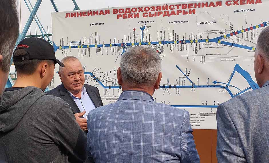 На линейной водохозяйственной схеме реки Сырдарьи наглядна трансграничность. Истоки в горах Кыргызстана. Далее река протекает по Узбекистану, Таджикистану, снова Узбекистану, затем протяженный участок по Казахстану и впадение Сырдарьи в Малый Арал. Об этом говорит Бактыбек Туюмбетов — инженер по сооружениям казахской части канала.