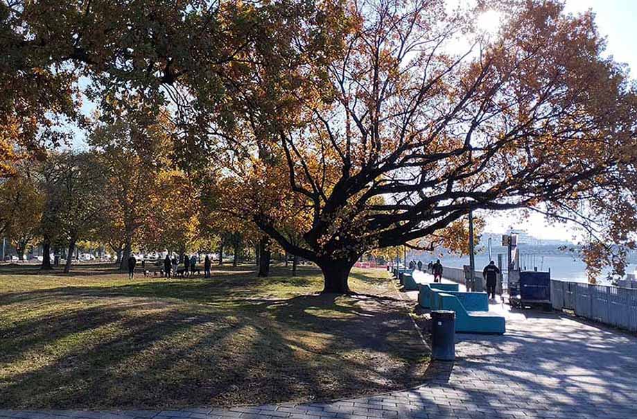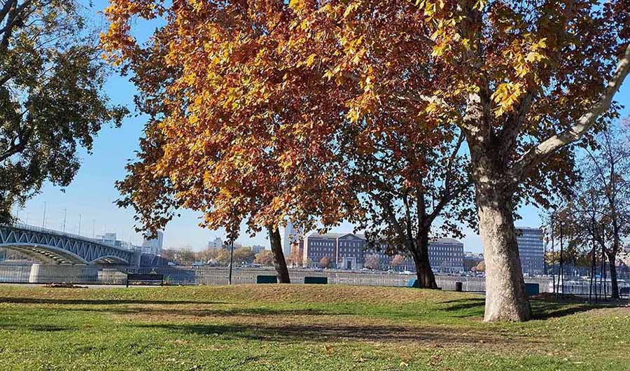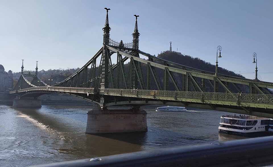 Платанов-чинар в Будапеште много. Украшают набережную. Мы находимся в Пеште. На той стороне реки — Буда. Всего мостов через Дунай в черте города пятнадцать. Но самых популярных восемь. Ажурный зеленый с птицами на шпилях называется Мостом Свободы. Построен в 1896 году в стиле модерн. На холме за мостом высится статуя Свободы.