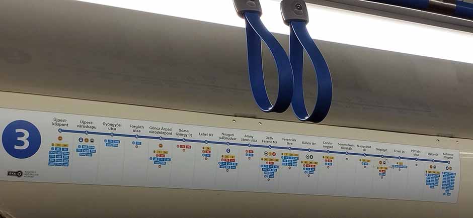 На этом фото в вагоне метро — пример заботы о пассажирах. На каждой остановке указаны виды общественного транспорта и номера.
