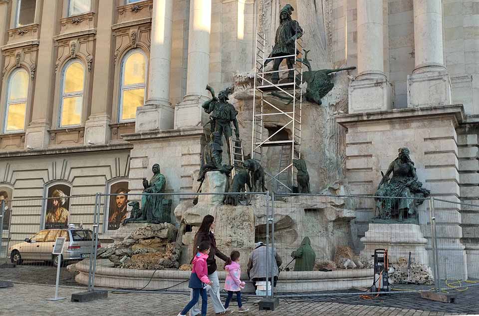 Вот эта бронзовая многофигурная композиция на самом деле — фонтан. У него есть название «Охота короля Матьяша». Король, естественно, разместился выше всех. Фонтан украшает стену королевского дворца. Сейчас он за забором, значит, на ремонте. Когда фонтанирует, судя по отзывам, привлекает зевак и их монетки.
