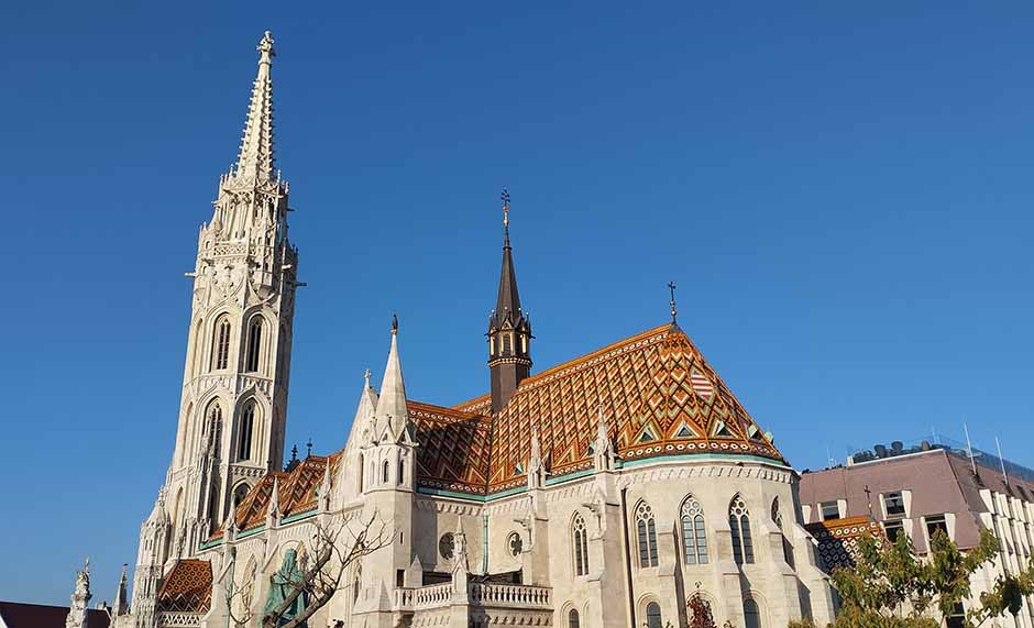 В центре всей «композиции» находится католическая церковь Матьяша. Она реально древняя. Построена во второй половине XIVвека в готическом стиле, что редкость для Венгрии. У нее неправильная прямоугольная форма. Высота колокольни – 80 метров. Это самое высокое сооружение в окрестностях. Кровля церкви покрыта знаменитой печской черепицей.