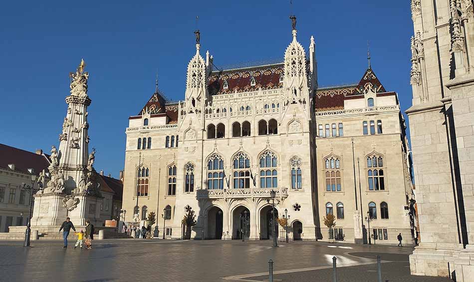 Главный всадник на коне, пожалуй, вот этот — принц Савойский из семейства Габсбургов. Статуя на высоком постаменте обращена к Дунаю, а на рельефах постамента экскурсии рассматривают изображения XVП века. Но мы глубоко в историю не погружаемся. Обозрим Дунай. Над ним возвышается изумительно красивое здание Парламента.