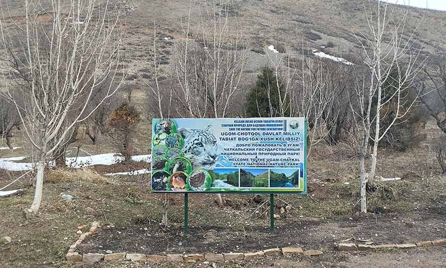 Единственное место, где мы увидели плакат с информацией про Угам-Чаткальский государственный национальный природный парк, так это в русле Чаткала. Напротив плаката расположен экологический пост. Здесь взимается экологический сбор. Ехать до Пальтау недалеко, несколько минут за Нижне-Чаткальской ГЭС.