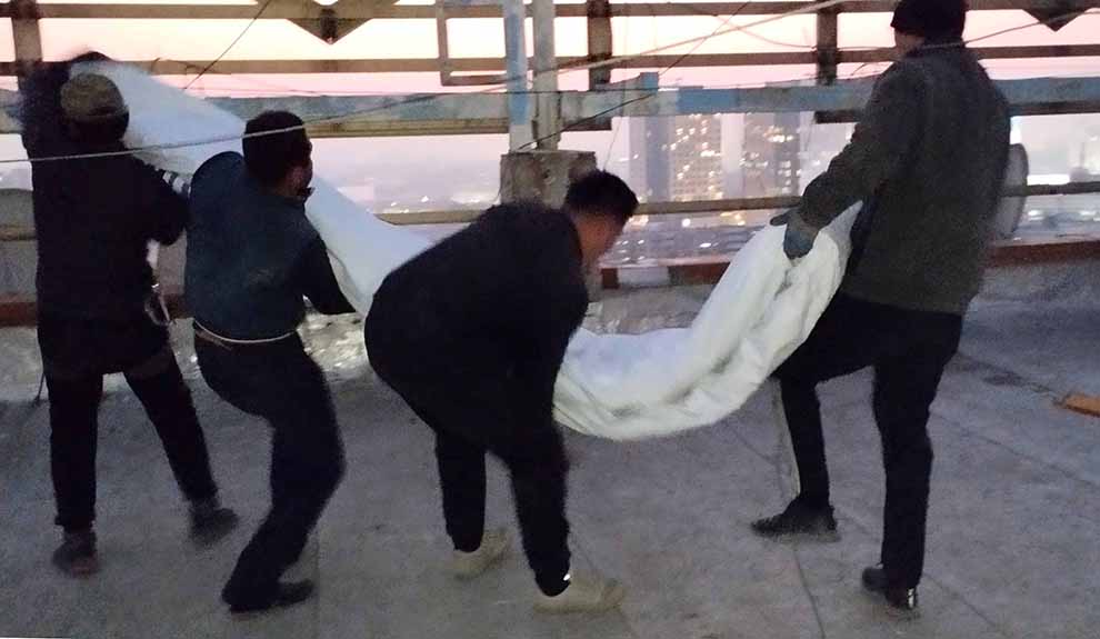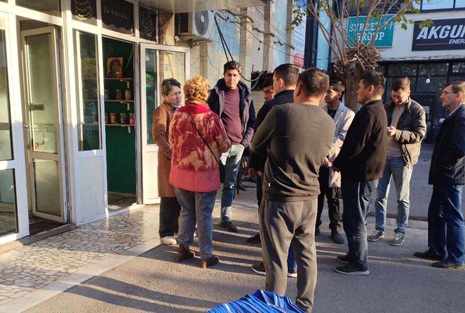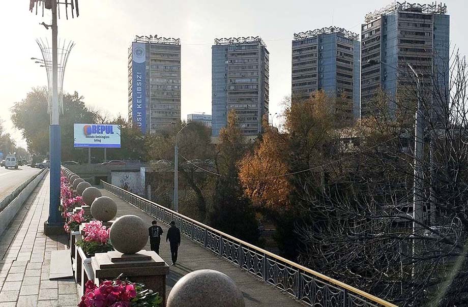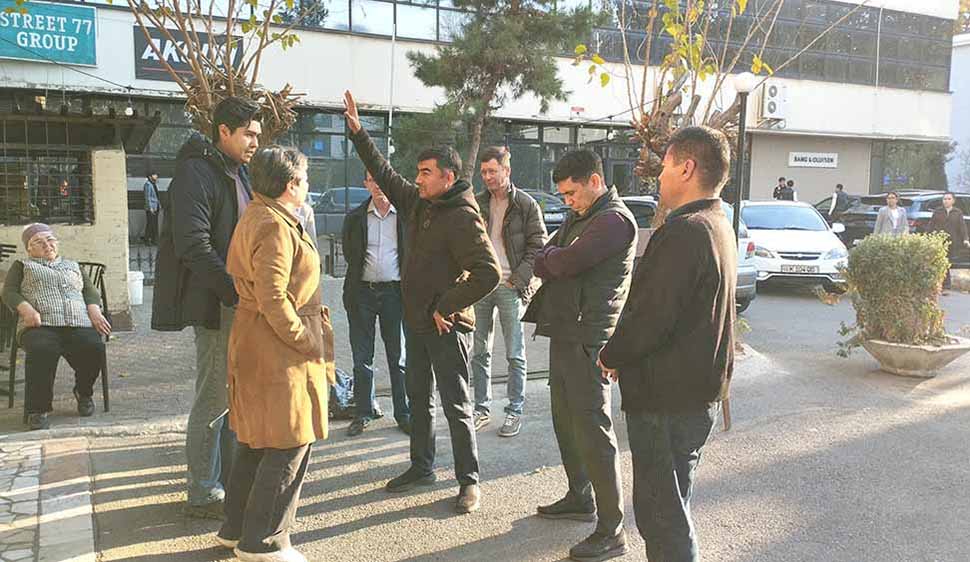 Тем временем вся команда, к которой присоединился еще и председатель махалли «Мустакиллик», затащила на 18 этаж баннер, веревки, болты, металлические штыри… Вот-вот мы свяжемся с МВД и сообщим о нарушении законодательства. Наконец голос в телефоне сообщает, что мы первые на связи с МВД. Музыка играть перестает. Связи для защиты больше нет.